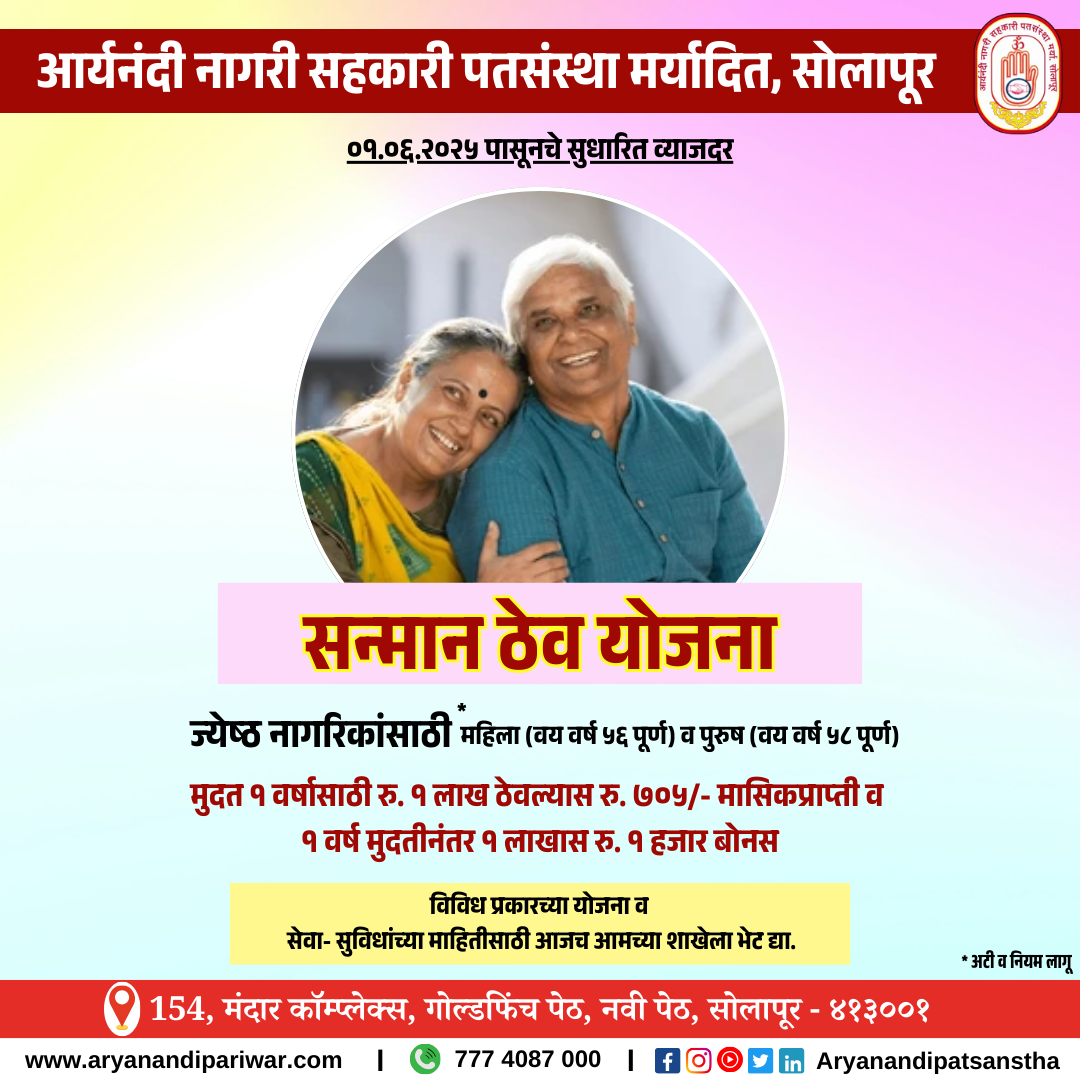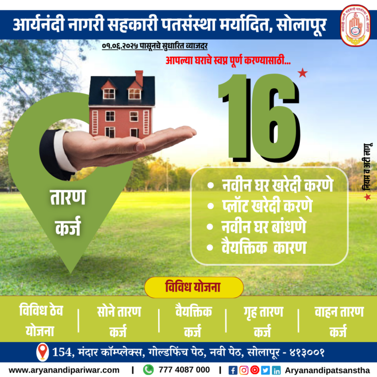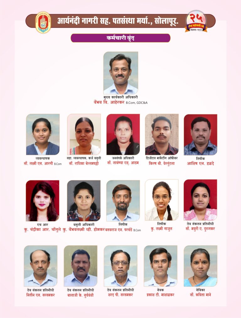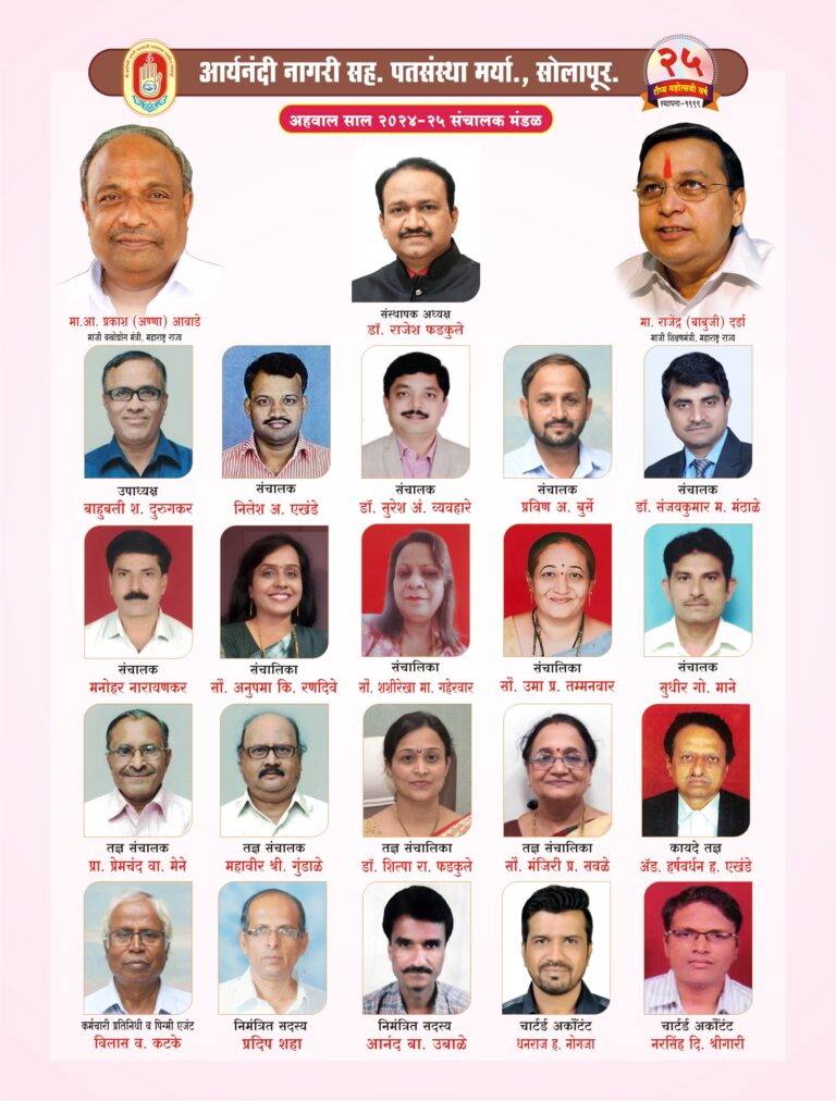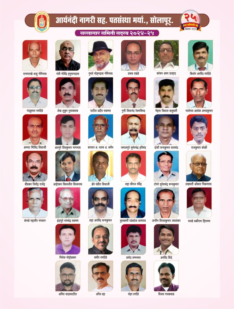 With the auspicious blessings of Param Pujya 108 Acharya Aryanandi Maharaj, in 1999, Aryanandi Nagari Sahkari Patsanstha Maryadit, Solapur established with a share capital of only fifteen thousand rupees, today It is a credit institution that has continuously achieved audit class (A) till date, successfully completing deposits of 50 crores and turnover of 100 crores on the strength of cooperation and trust. The said credit institution is an ideal civic cooperative award winning credit institution and this is the 25rd year of the credit institution. Aryanandi Patsanstha Best loan service in solapur , Mini financial services in solapur.