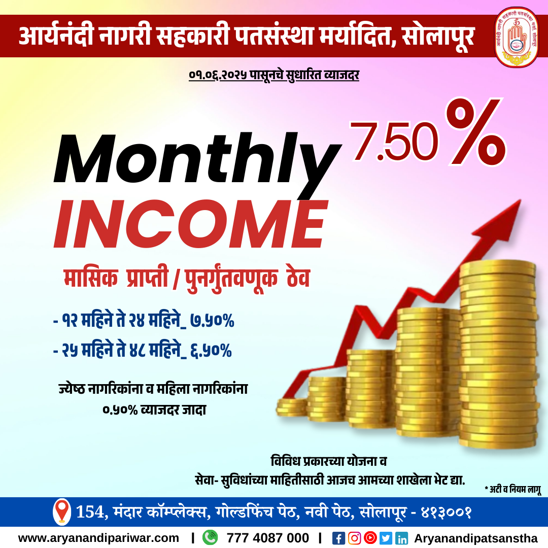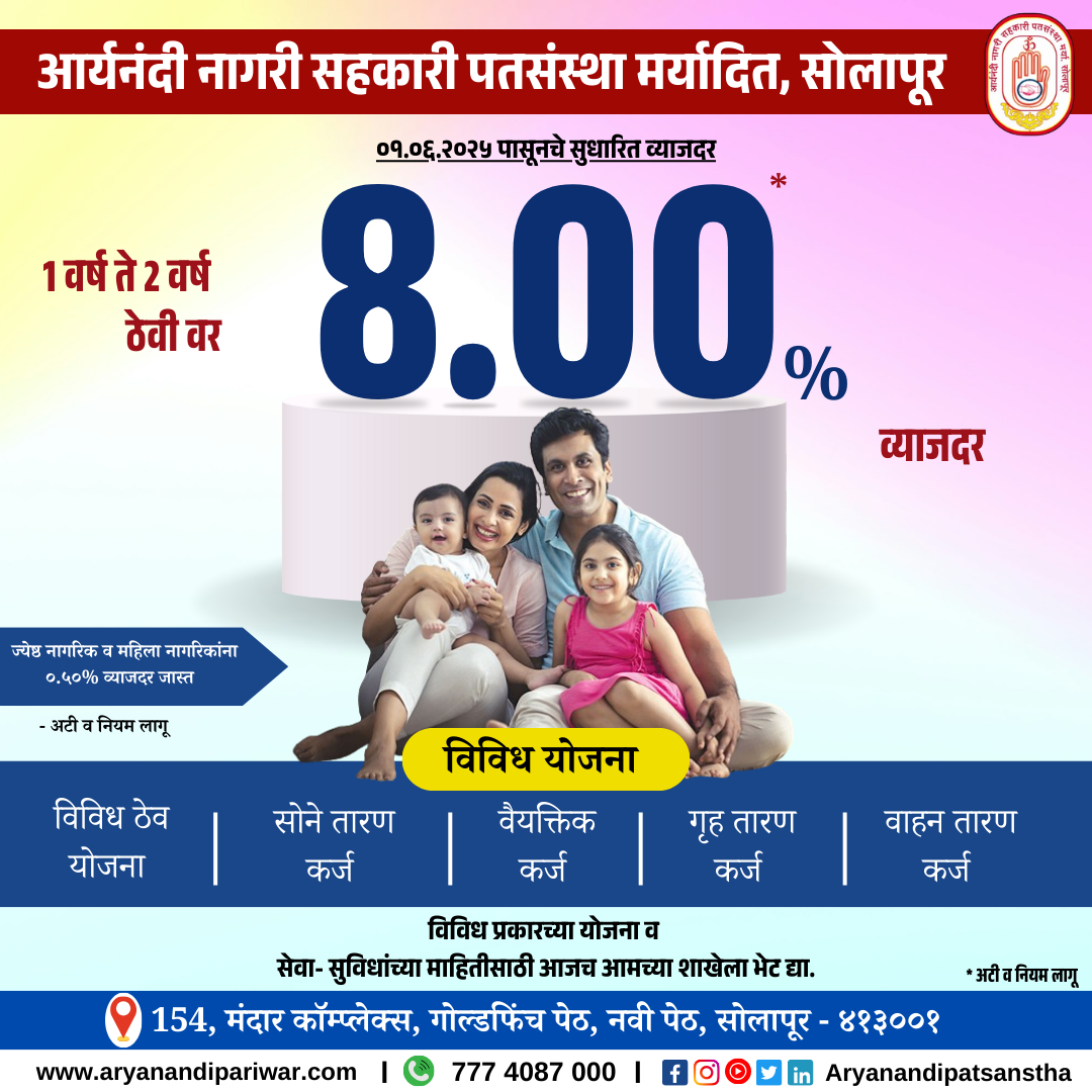 Aryanandi Patsanstha Best loan services in solapur & Mini financial services in solapur. fixed deposit, mortgage loan, personal loan, gold loan, vehicle loan, car loan, saving account, dam duppat deposit, NEFT, RTGS, SMS alerts, check balance, mini statement, bill payment ...