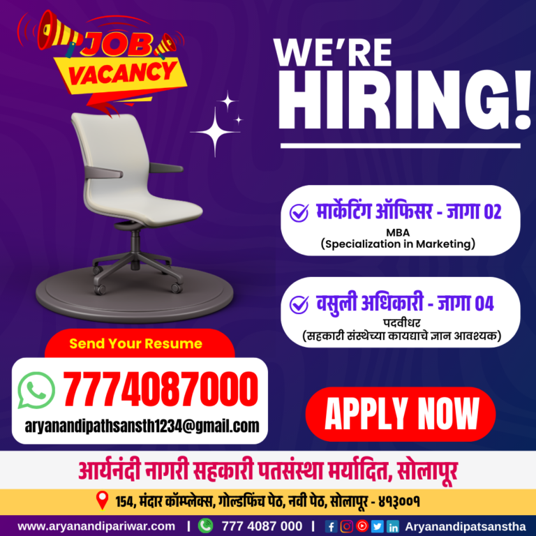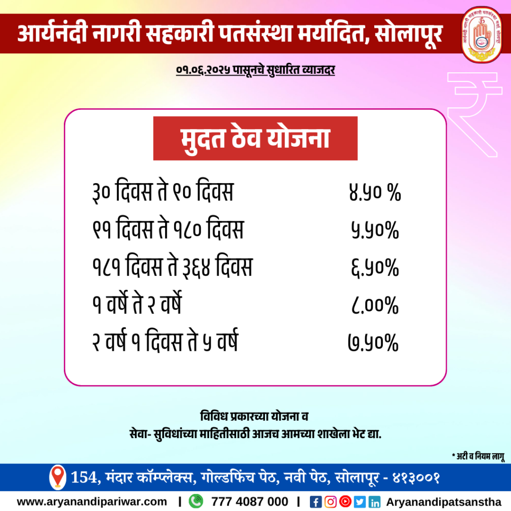 With the auspicious blessings of Param Pujya 108 Acharya Aryanandi Maharaj, in 1999, Aryanandi Nagari Sahkari Patsanstha Maryadit, Solapur established with a share capital of only fifteen thousand rupees, today It is a credit institution that has continuously achieved audit class (A) till date, successfully completing deposits of 50 crores and turnover of 100 crores on the strength of cooperation and trust. The said credit institution is an ideal civic cooperative award winning credit institution and this is the 25rd year of the credit institution. Aryanandi Patsanstha Best loan service in solapur , Mini financial services in solapur.