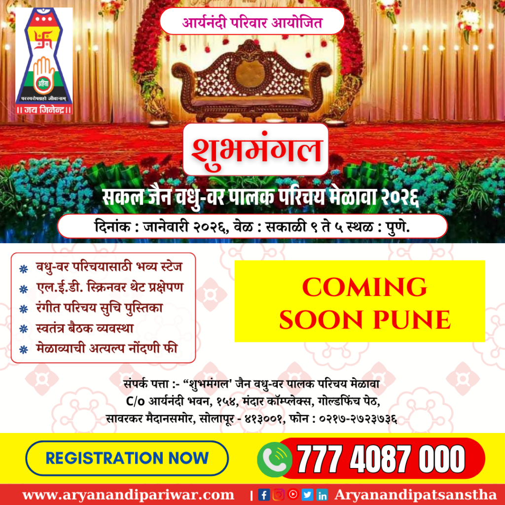 Inspired by the thoughts and works of Param Pujya 108 Acharya Aryanandi Maharaj, established with his blessings "Aryanandi Pariwar" today is successfully moving towards the Silver Jubilee with the support and trust of all of you. Aryanandi Pariwar running Aryanandi Nagri Sahkari Patsanstha Maryadit Solapur, Aryanandi Nidhi Ltd, started as a social commitment, Aryanandi Education and Research Foundation, Aryanandi Infrastructure Pvt.Ltd., Aryanandi Cultural Foundation, Aryanandi Sandesh (Monthly) Along with economic sectors such as cooperation, literature, health, social work, educational classes. "Aryanandi Pariwar" is a pride of the city of Solapur for its revolutionary and remarkable work in the field of journalism family.