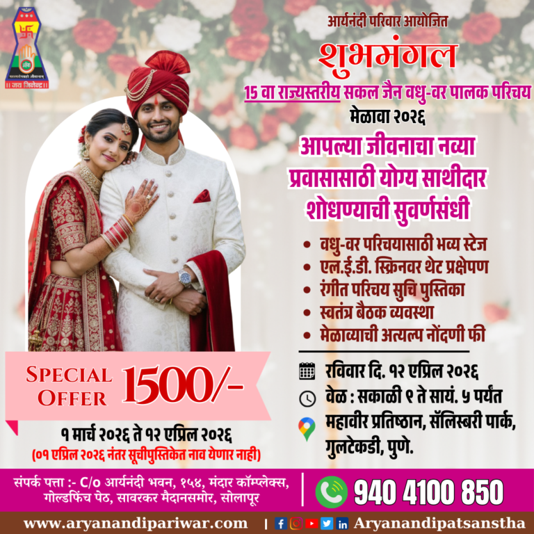 आर्यनंदी एज्युकेशन अँड रिसर्च फाउंडेशन आयोजित, राज्यस्तरीय शुभमंगल सकल जैन समाज वधू-वर पालक परिचय मेळावा 2025, रविवार दिनांक 17/08/2025 रोजी सोलापूर शहरातील मयूर क्लासिक मल्टीपर्पस हॉल, इंचगिरी मठ जवळ, विजापूर रोड, सोलापूर येथे अतिशय भव्य- दिव्य पद्धतीने पार पडला.